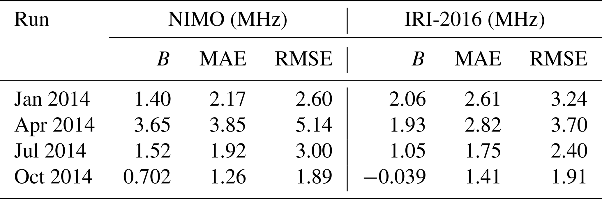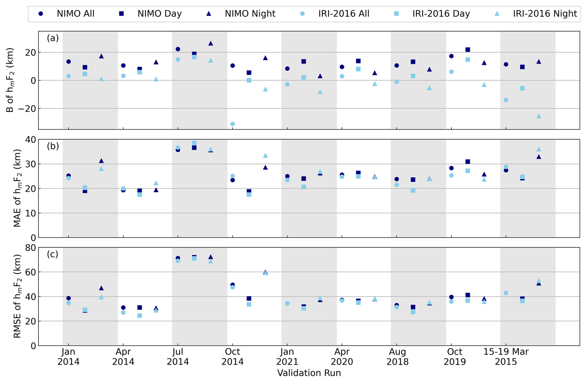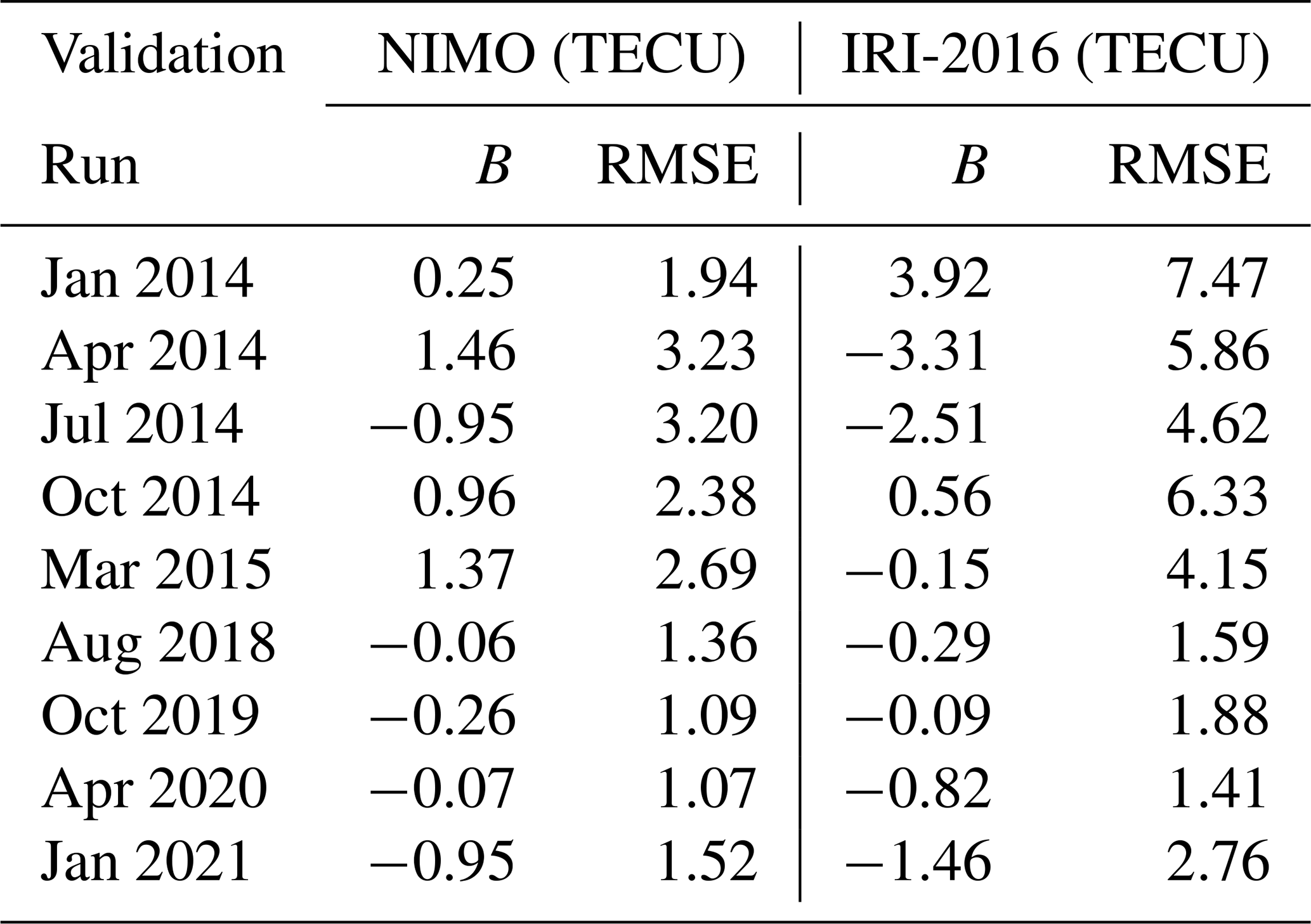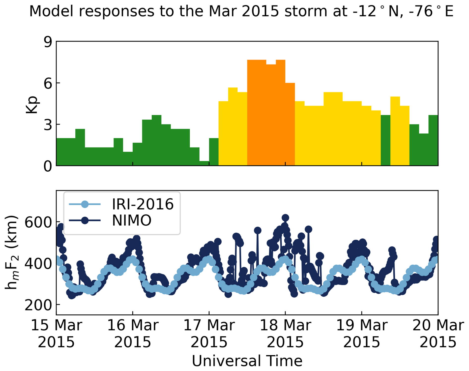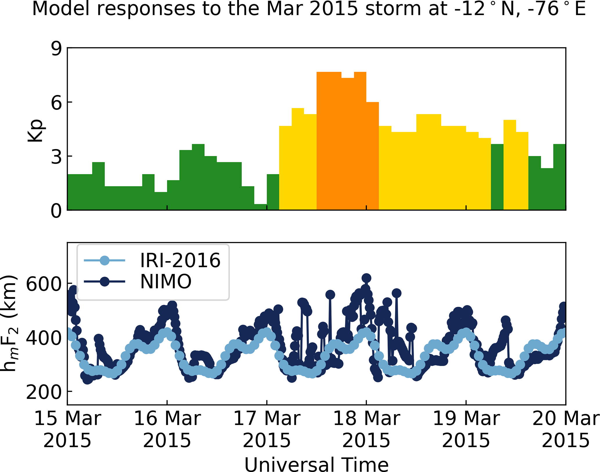 The ionosonde validation showed no consistent local time variations in the relative performance of the two models. It found that NIMO performed better than IRI-2016 when modeling the foF2, while IRI-2016 did slightly better at modeling the hmF2. The only exception is times with geomagnetic storms, where NIMO consistently modeled the F2 peak characteristics better than IRI-2016. In Fig. 7 at around 01:30 UT the model matches an unrealistic hmF2. This problem comes from how the ionosonde data is quality controlled and how IDA4D assimilates the data. Work is ongoing to improve cleaning of ingested data and how the data assimilation system handles outlier data.