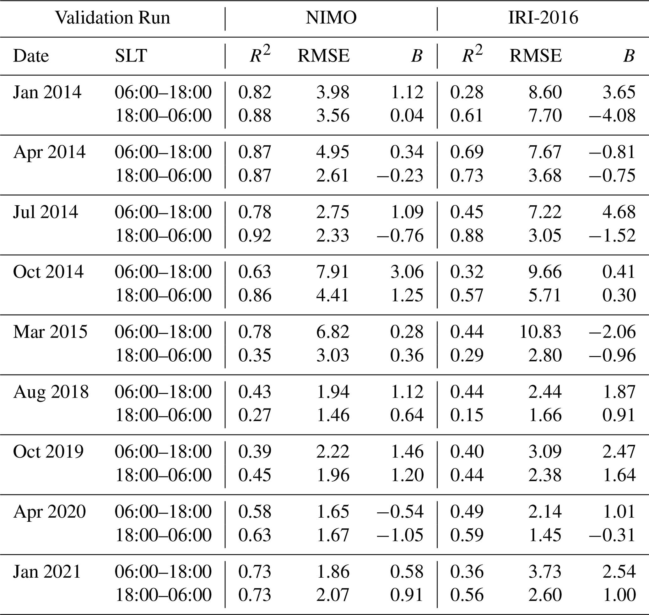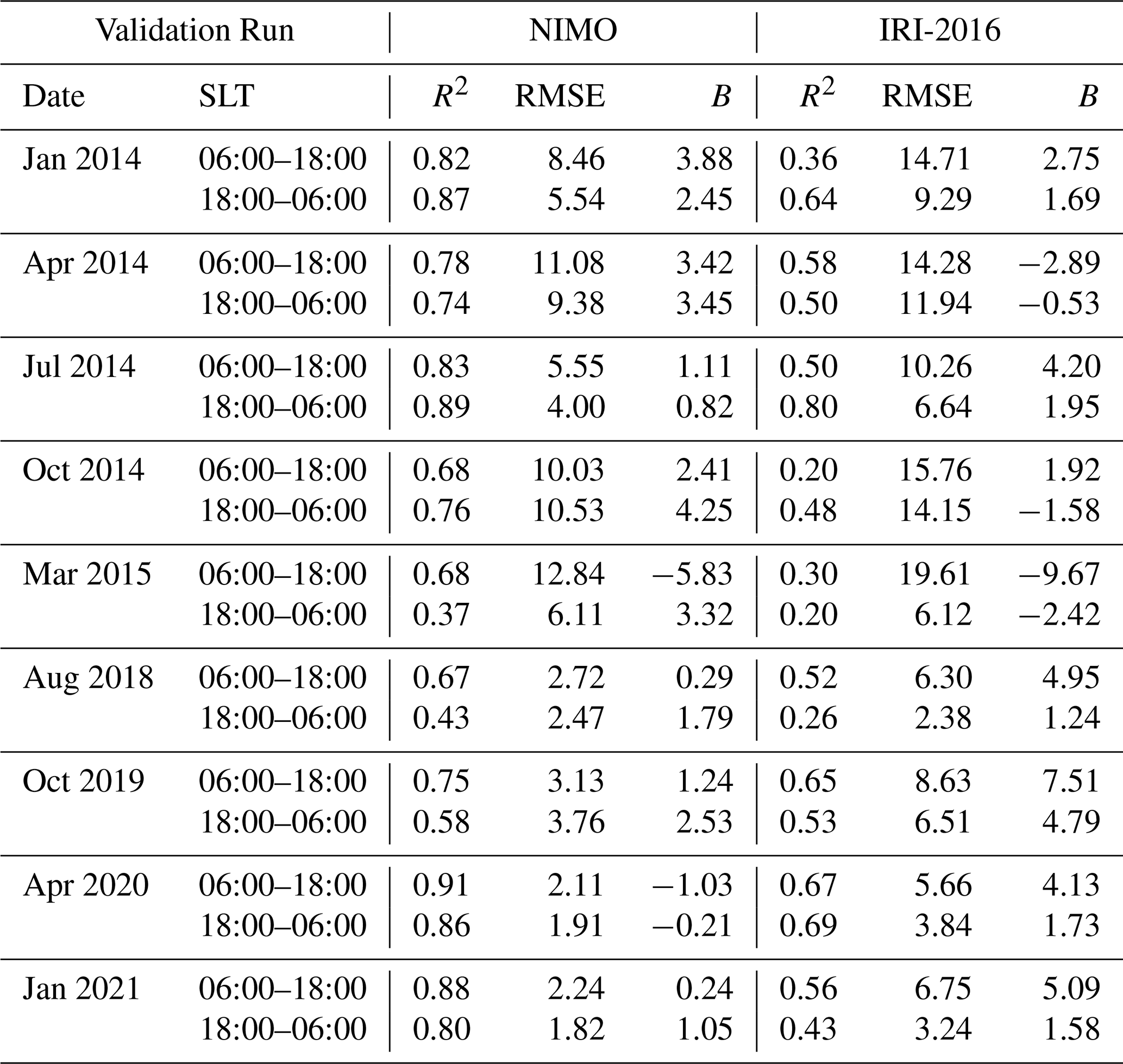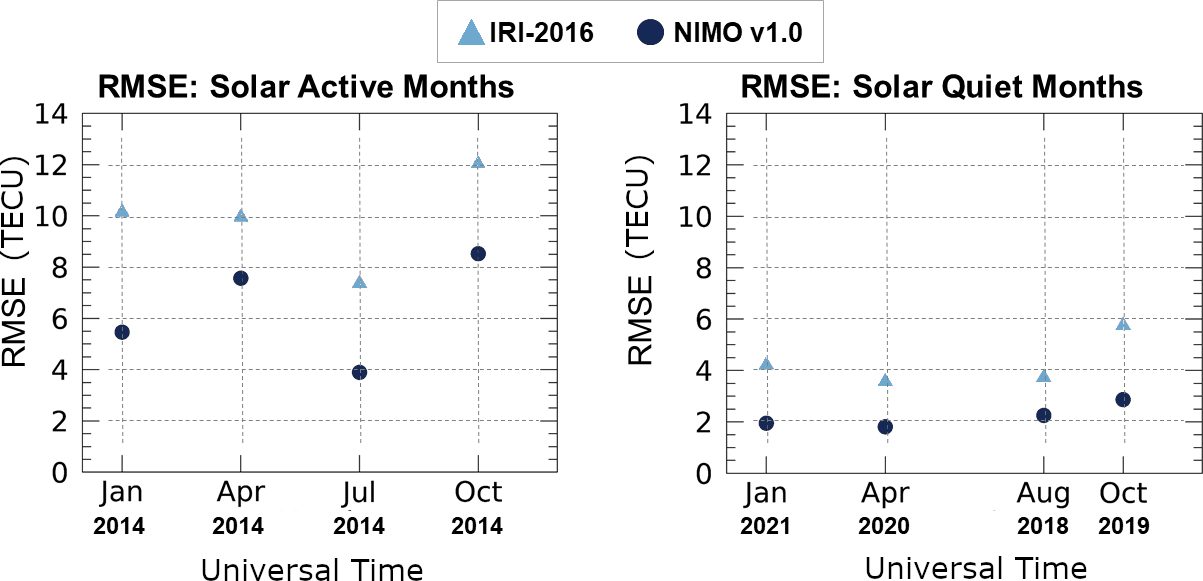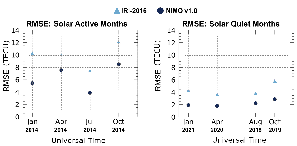 IRI-2016 was chosen to compare against because it was the most up-to-date version at the time this validation was performed. Since 2014, IRI has been recognized as the official standard for the Earth's ionosphere by the International Standardization Organization (ISO) (ISO 16457:20142014; ISO 16457:20222022). It is similarly endorsed by the International Union of Radio Science, the Committee on Space Research, and the European Cooperation for Space Standardization (Bilitza et al.2022). Future versions of NIMO and other ionospheric models (empirical, first-principles, or assimilative), may compare their performance against these results.