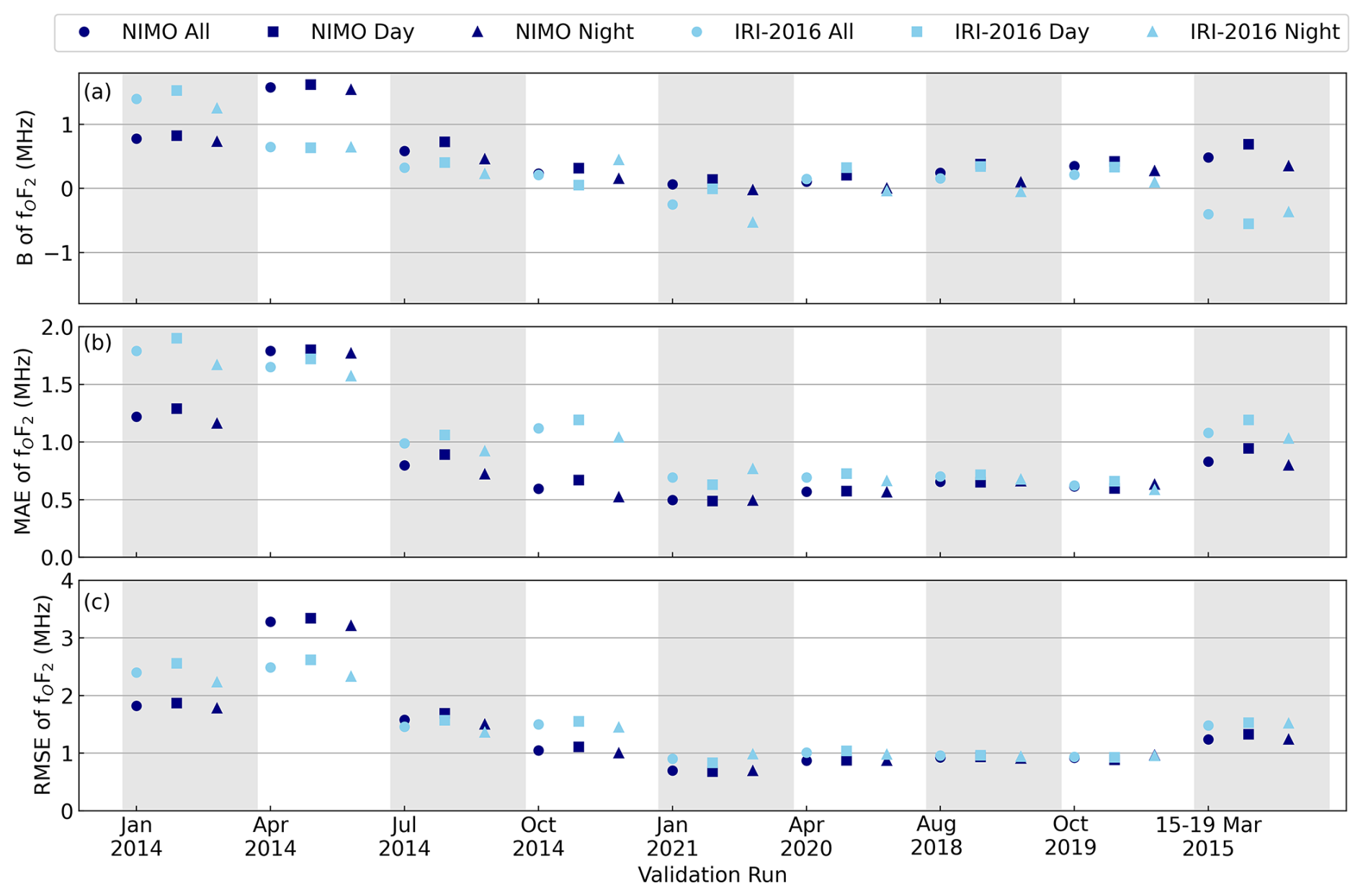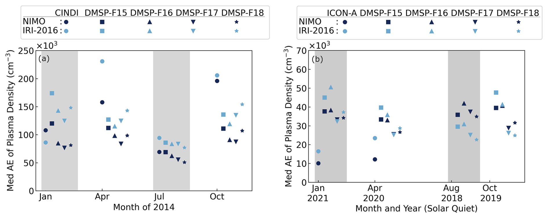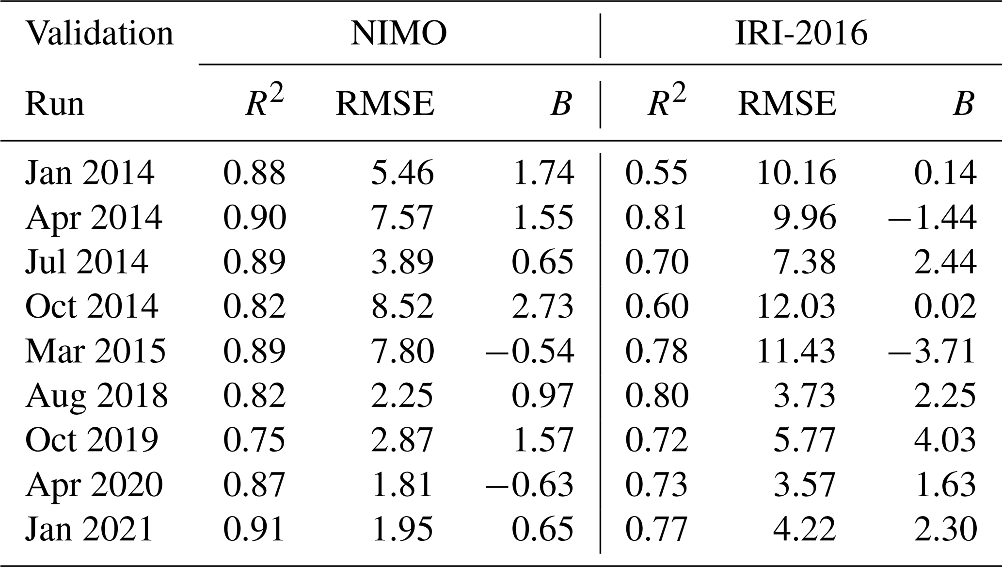 IRI-2016 was chosen to compare against because it was the most up-to-date version at the time this validation was performed. Since 2014, IRI has been recognized as the official standard for the Earth's ionosphere by the International Standardization Organization (ISO) (ISO 16457:20142014; ISO 16457:20222022). It is similarly endorsed by the International Union of Radio Science, the Committee on Space Research, and the European Cooperation for Space Standardization (Bilitza et al.2022). Future versions of NIMO and other ionospheric models (empirical, first-principles, or assimilative), may compare their performance against these results.