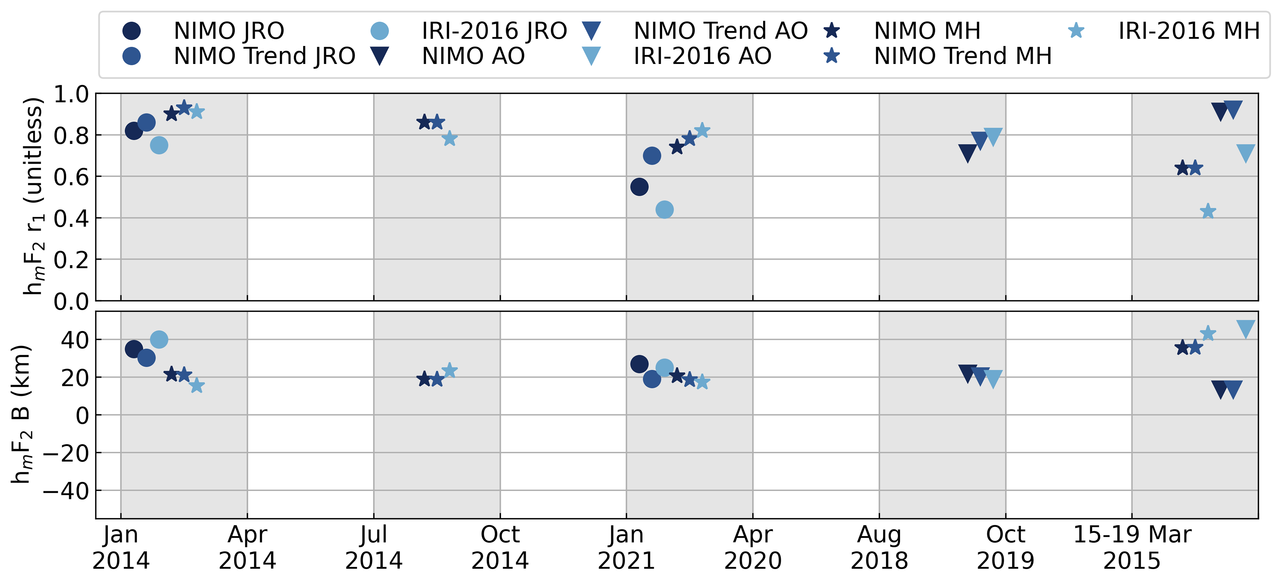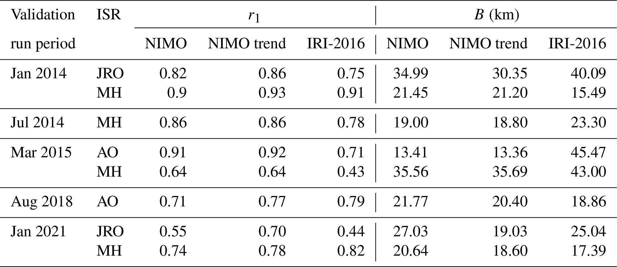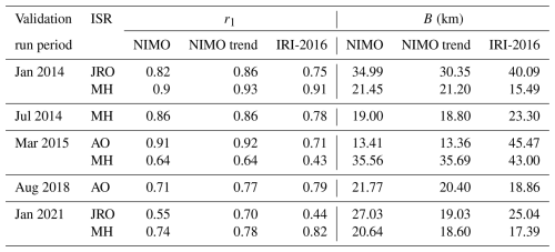 Table A3NIMO trends and IRI-2016 correlation factor (r1) with the ISR data for hmF2 at the ISR locations.
