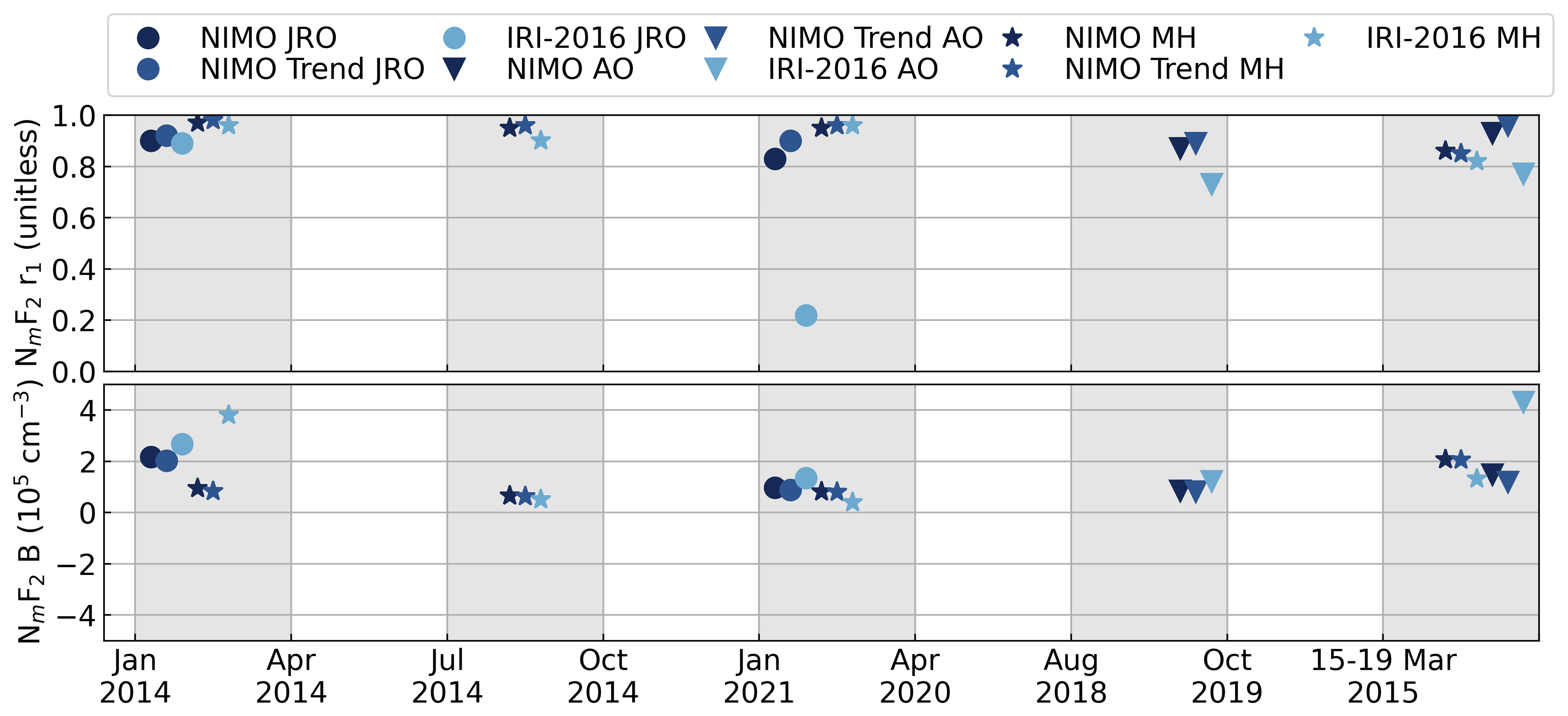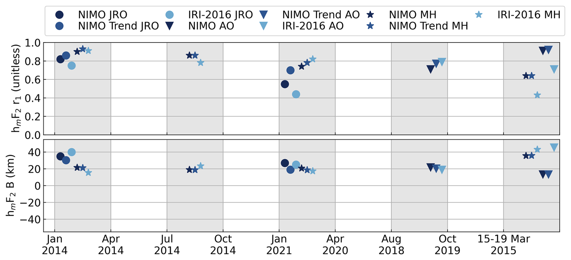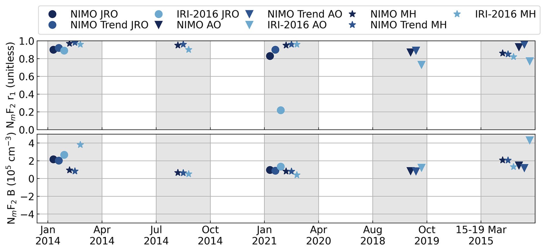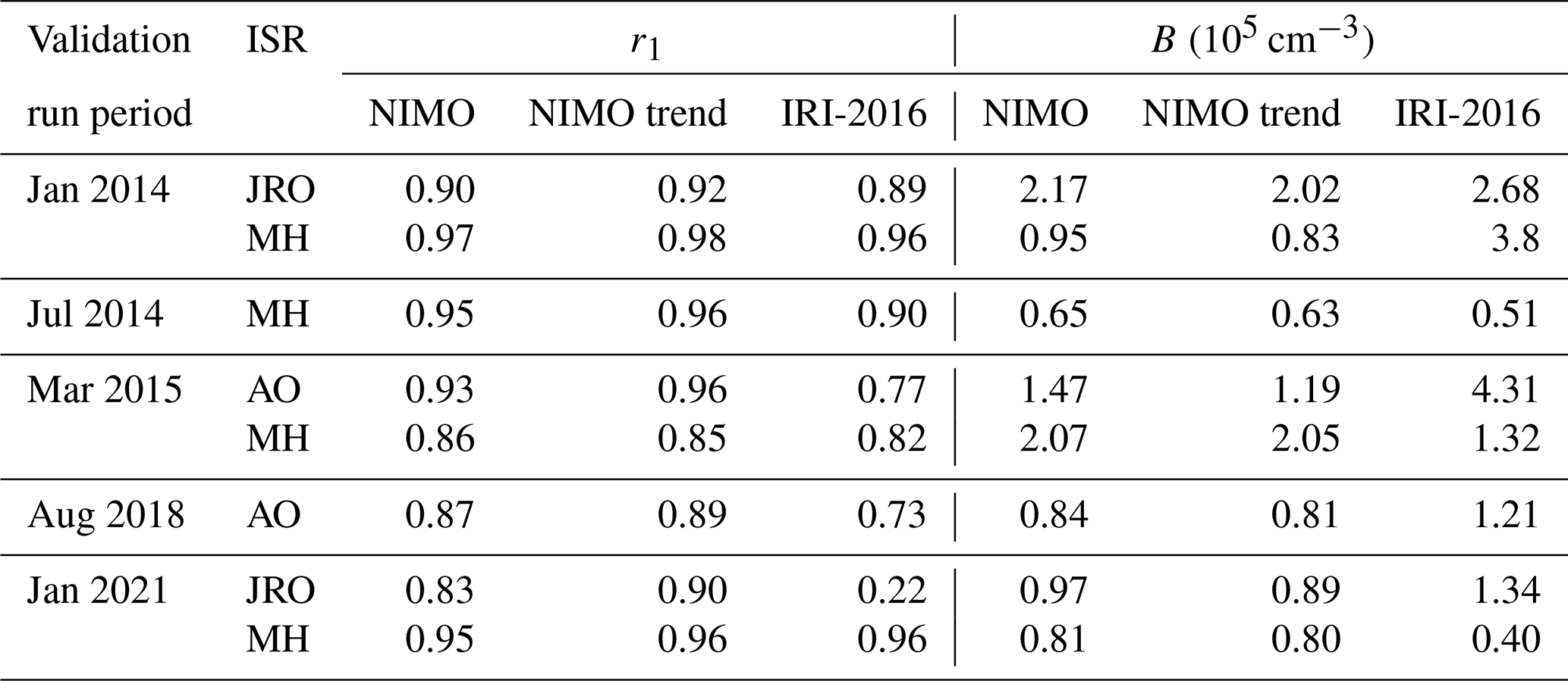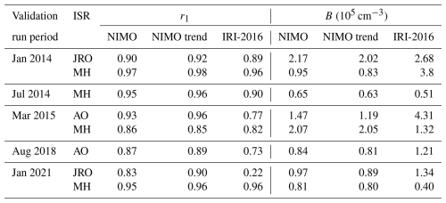 Table A4NIMO trends and IRI-2016 correlation factor (r1) with the ISR data for NmF2 at the ISR locations.