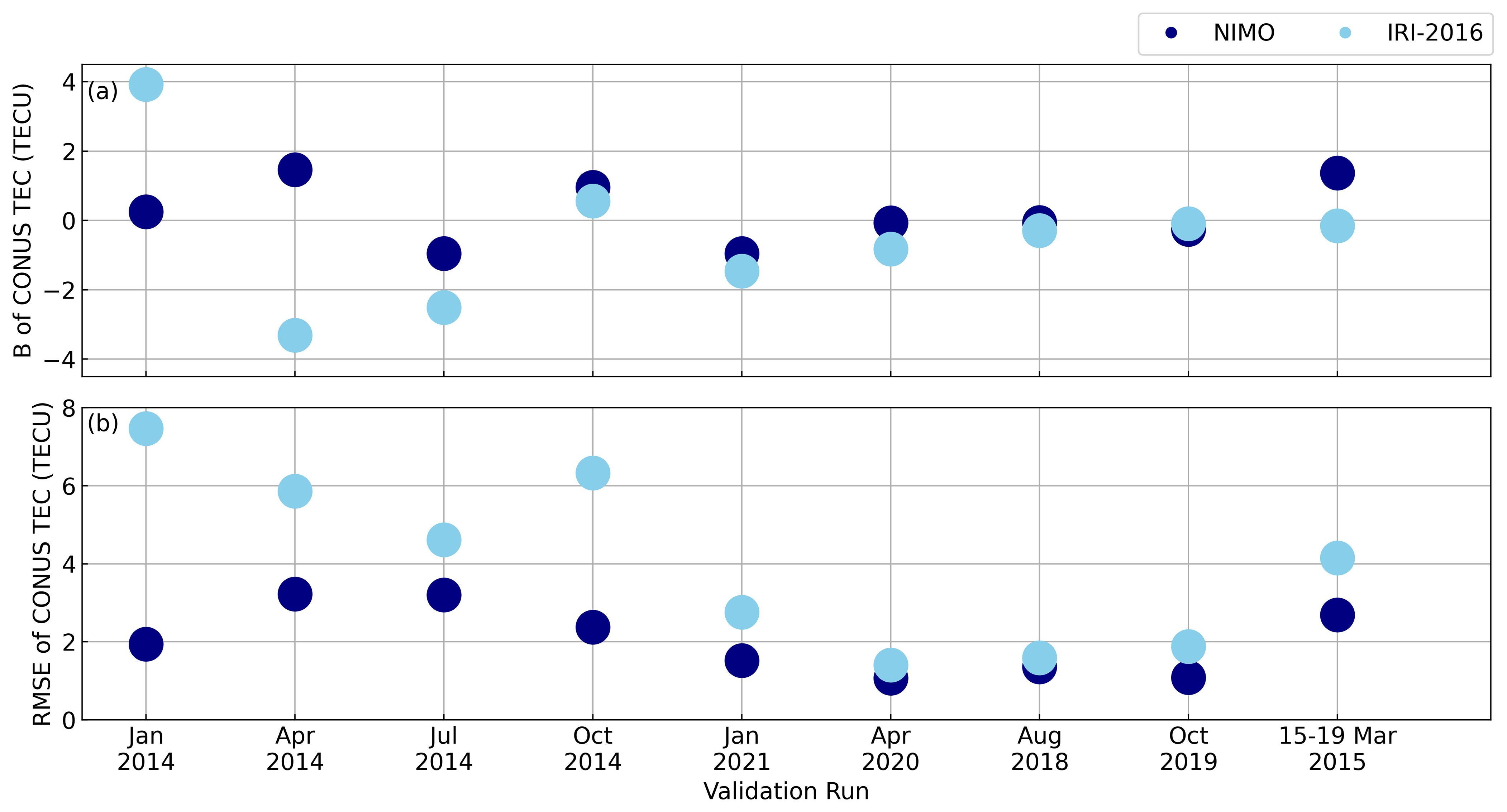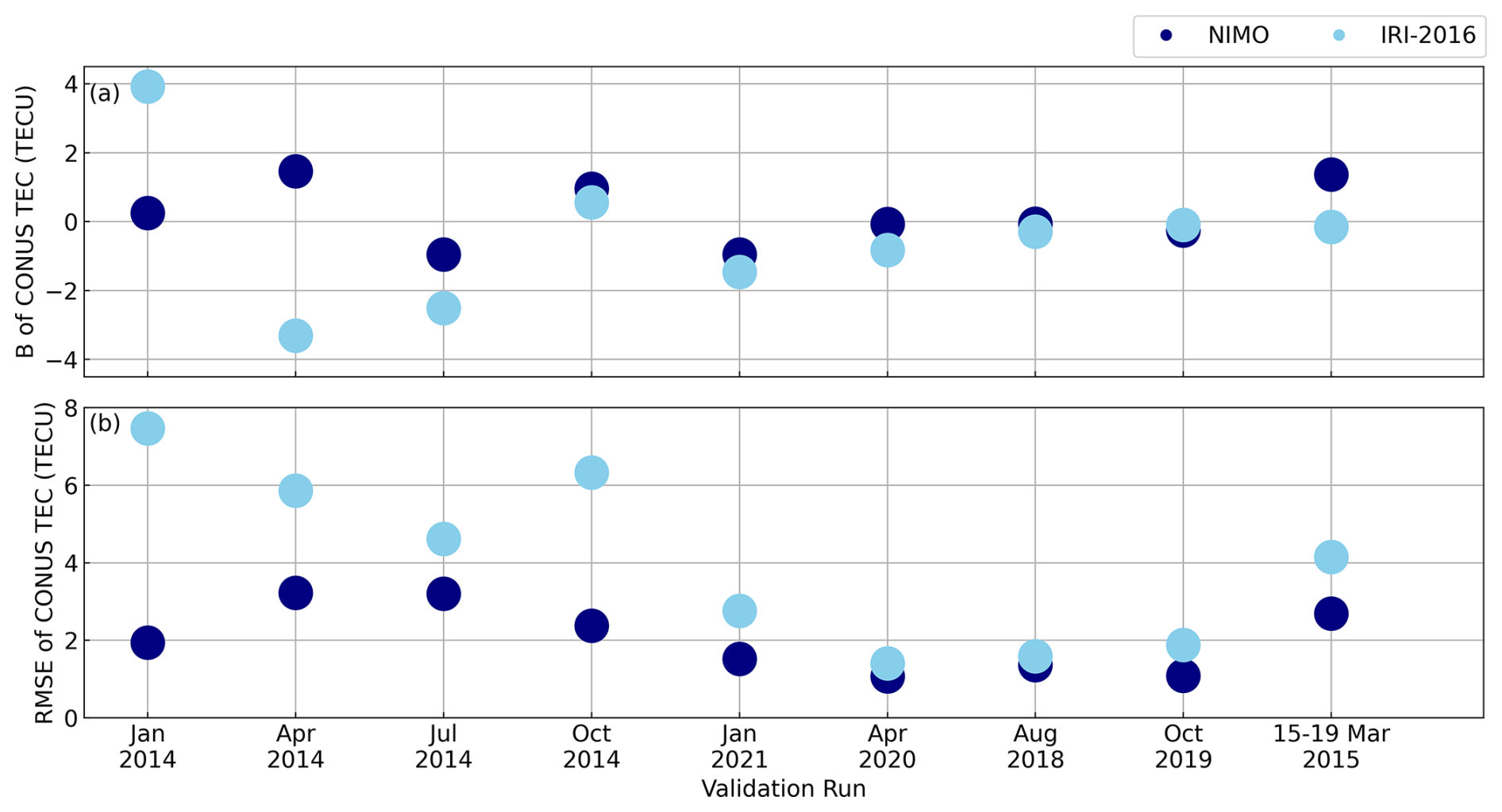 The CONUS GNSS TEC validation found that NIMO continued to outperform IRI-2016, with the RMSE reflecting NIMO's ability to capture day-to-day variations in the VTEC over each validation period. Both the B and RMSE showed that NIMO performed better in the CONUS region of interest at solar quiet times, with the solar active periods and the storm validation run having similarly worse RMSE values.