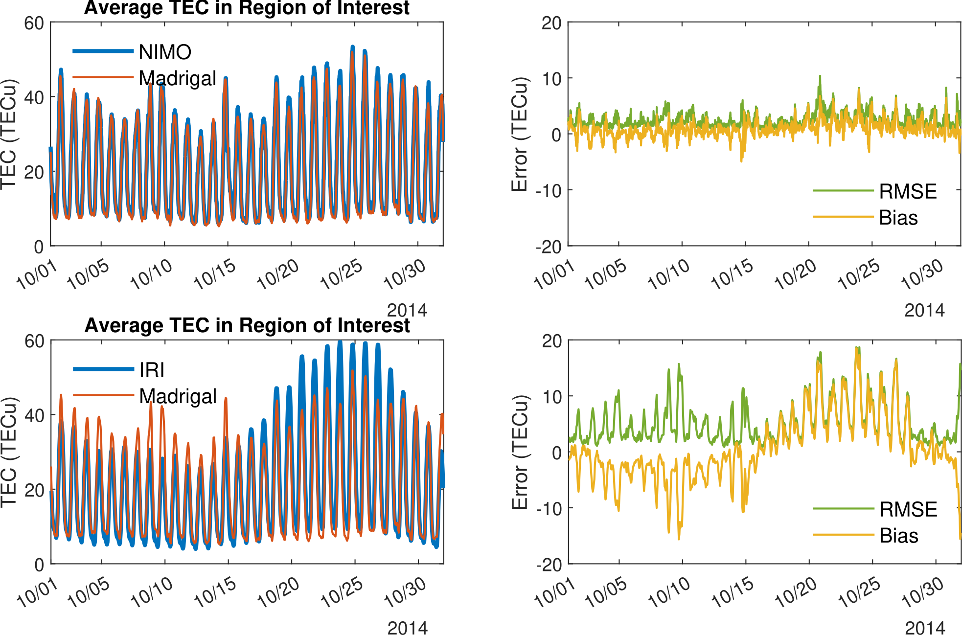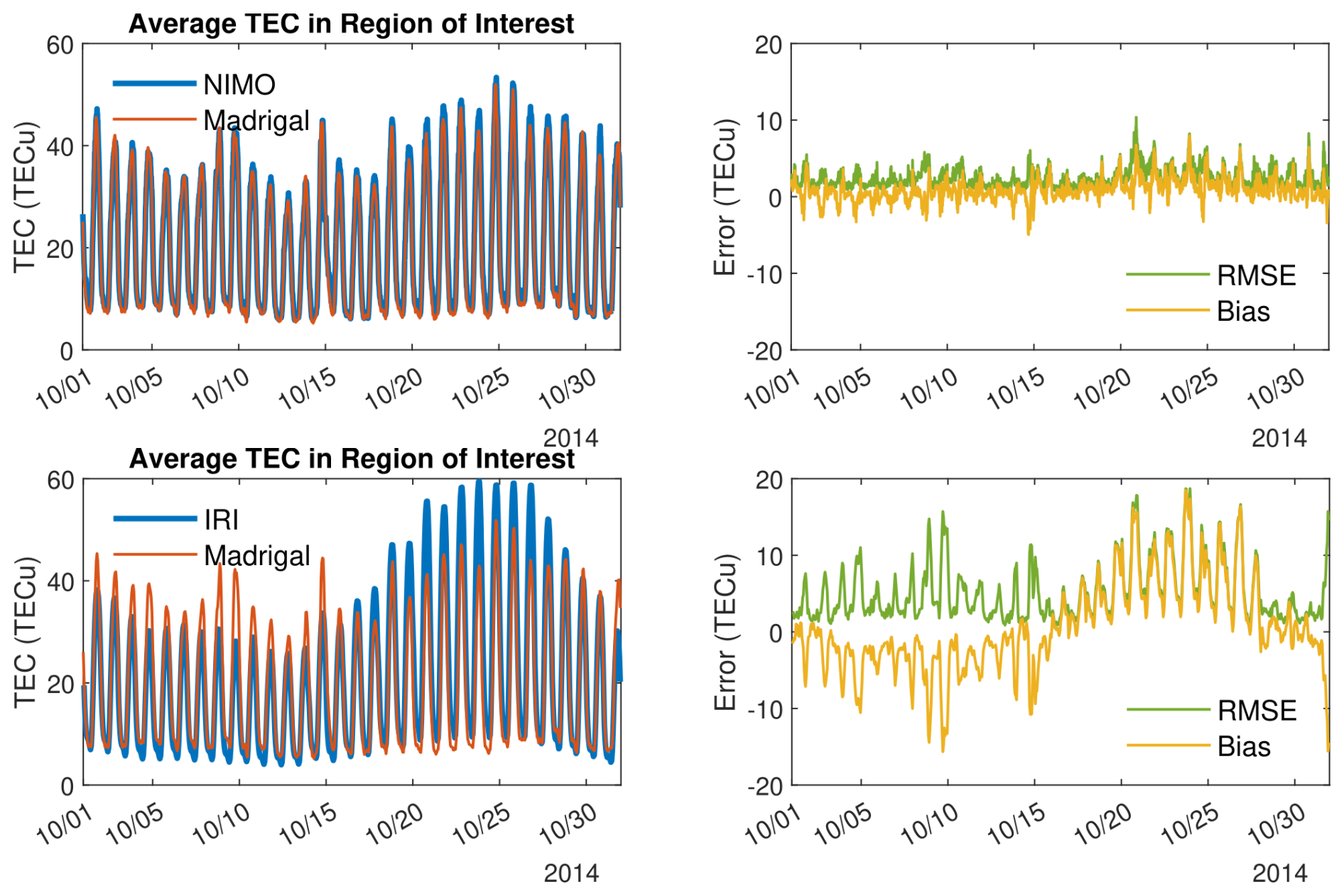 As was the case with the ionosonde data, TEC was also ingested into the NIMO data assimilation. However, in this instance the assimilated TEC was obtained from a different source and does not retain any information about the receiver bias calibration, as the relative TEC (not the total slant or vertical TEC) is assimilated. Thus, the validation data set will be distinct from the assimilated data set, even if the same satellite-receiver pairs are used, especially when considering statistics such as the bias.