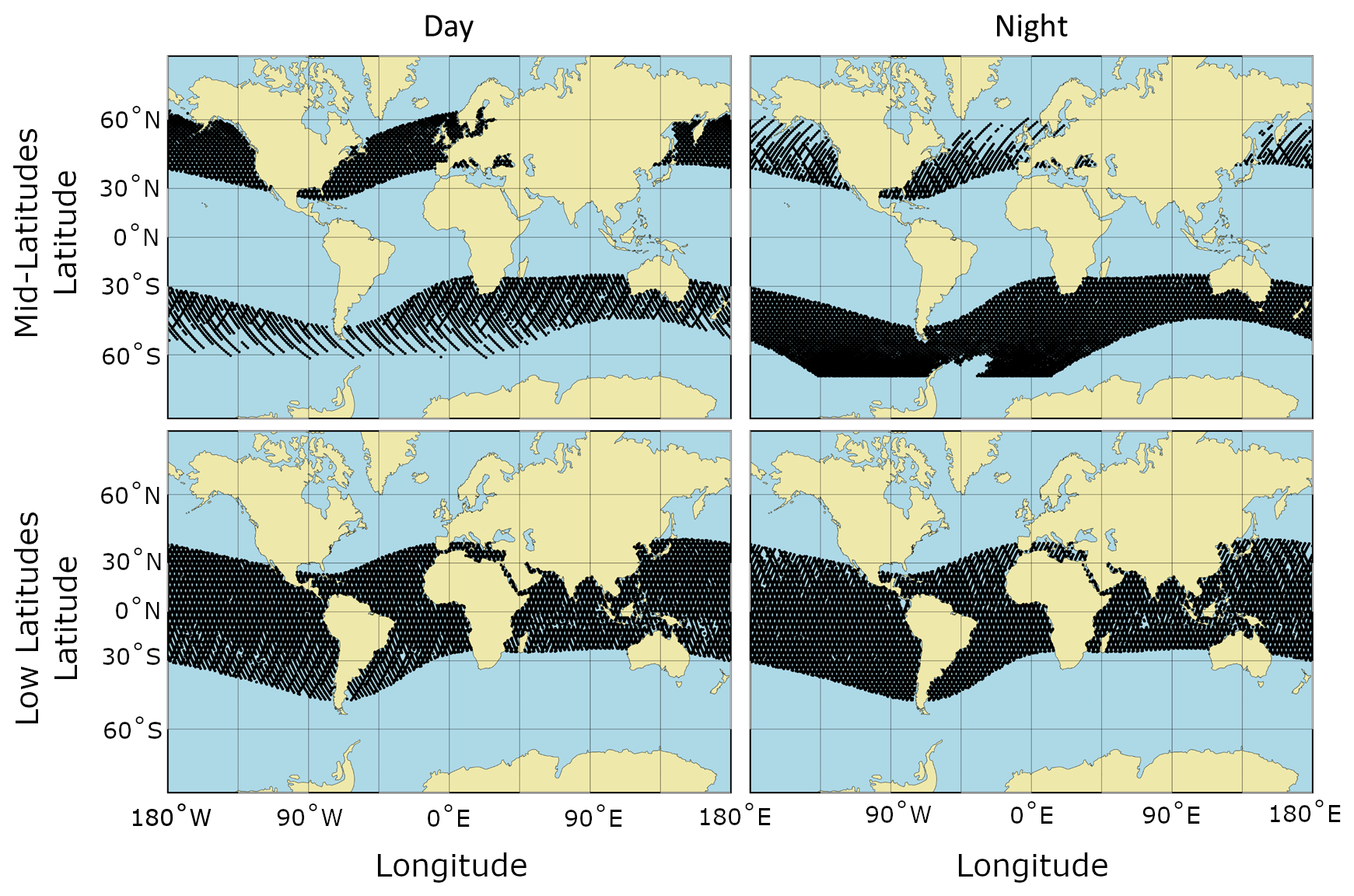 Table A10Global, topside ionosphere statistics from CINDI, DMSP, and ICON for all local times.