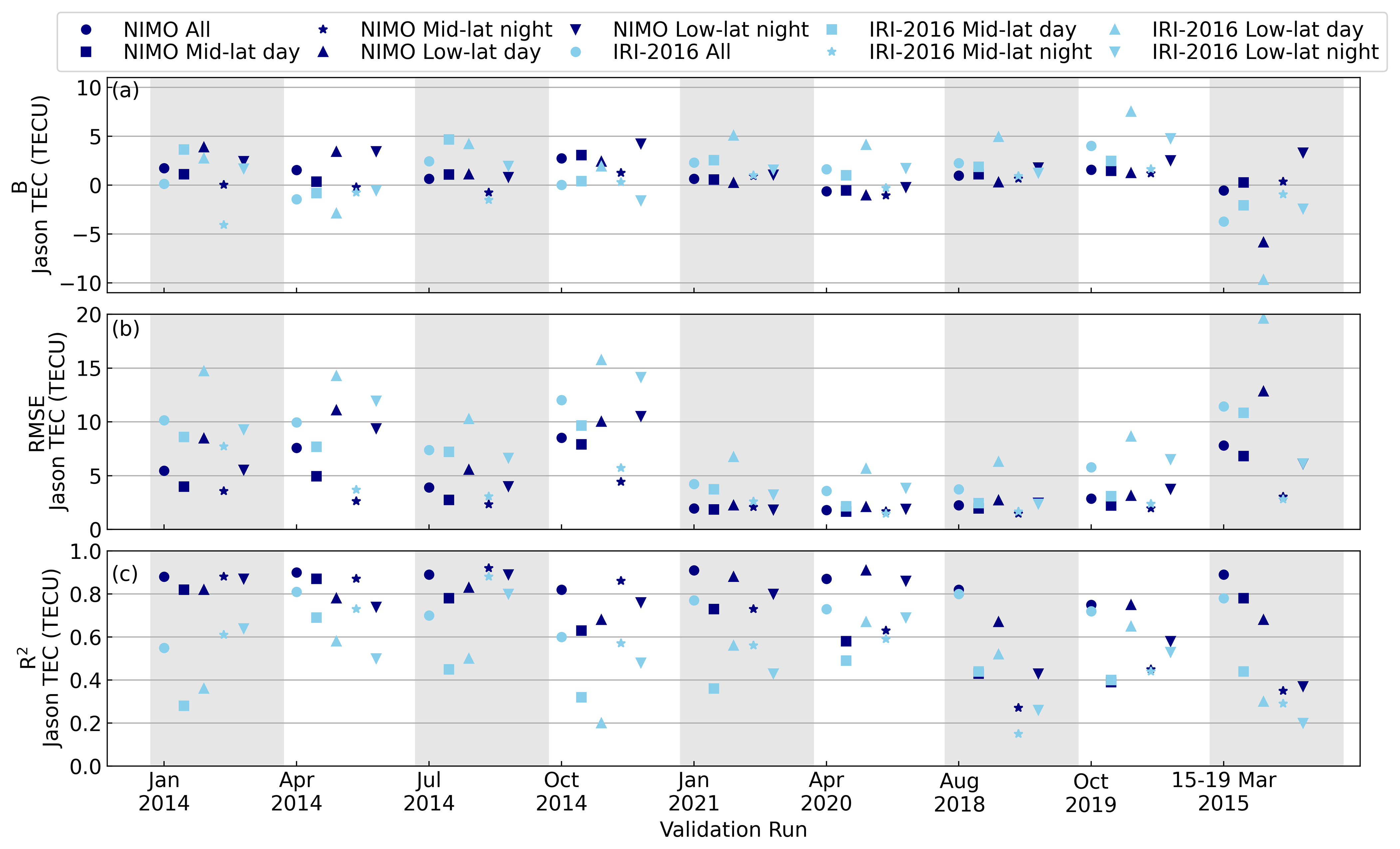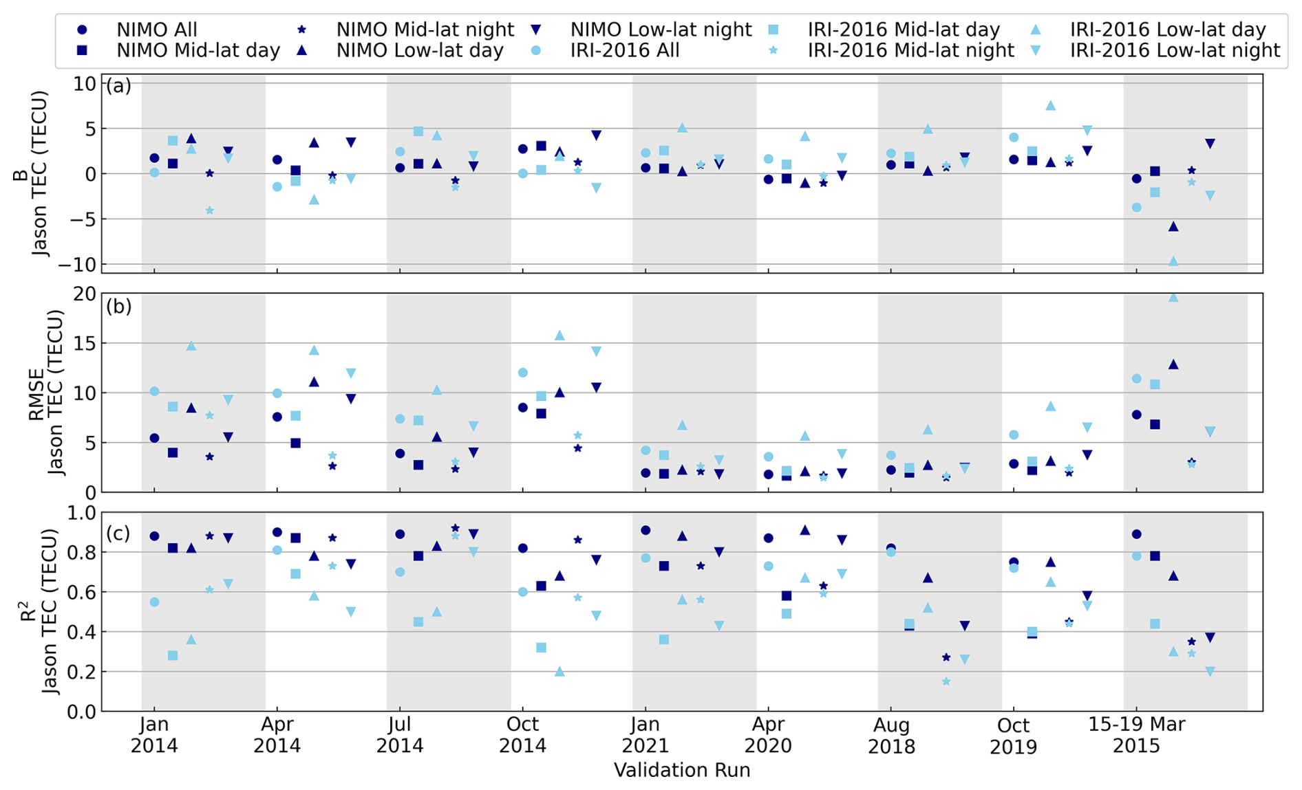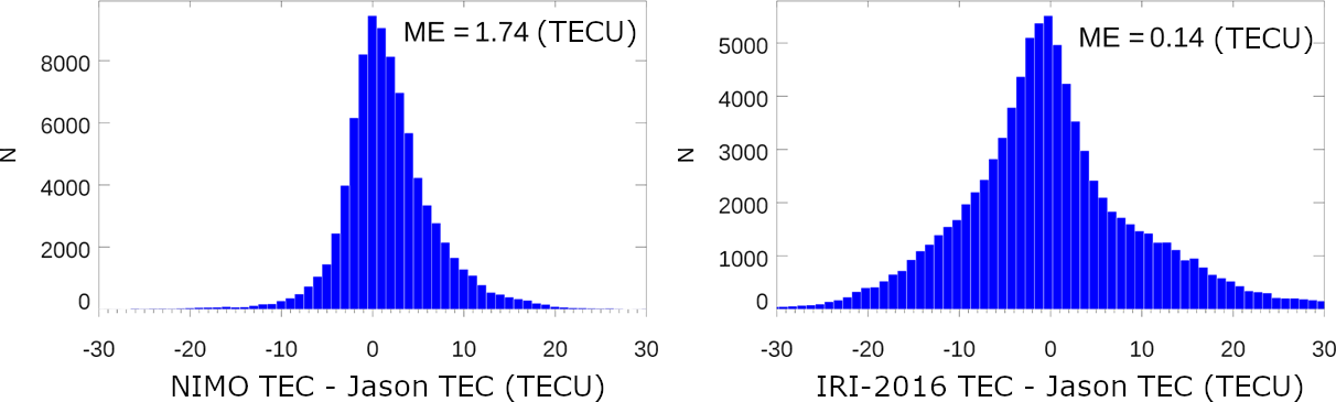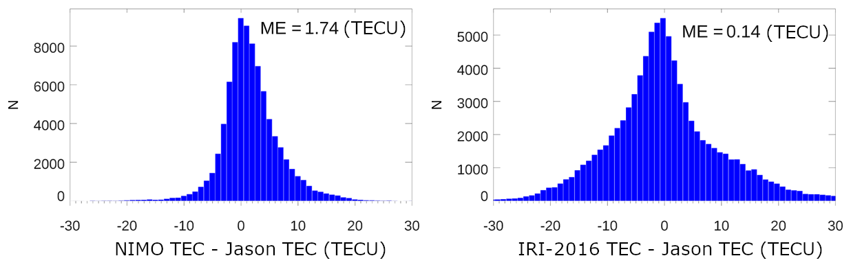 The JASON TEC validation focused on the model performance over the oceans, where the amount of data contributing to assimilation or the formation of an empirical model is low. It found that NIMO better represented the TEC over the oceans than IRI-2016 in all the validation runs. This performance was consistent when looking at the global picture or narrowing the focus to smaller latitudinal and local time regions.