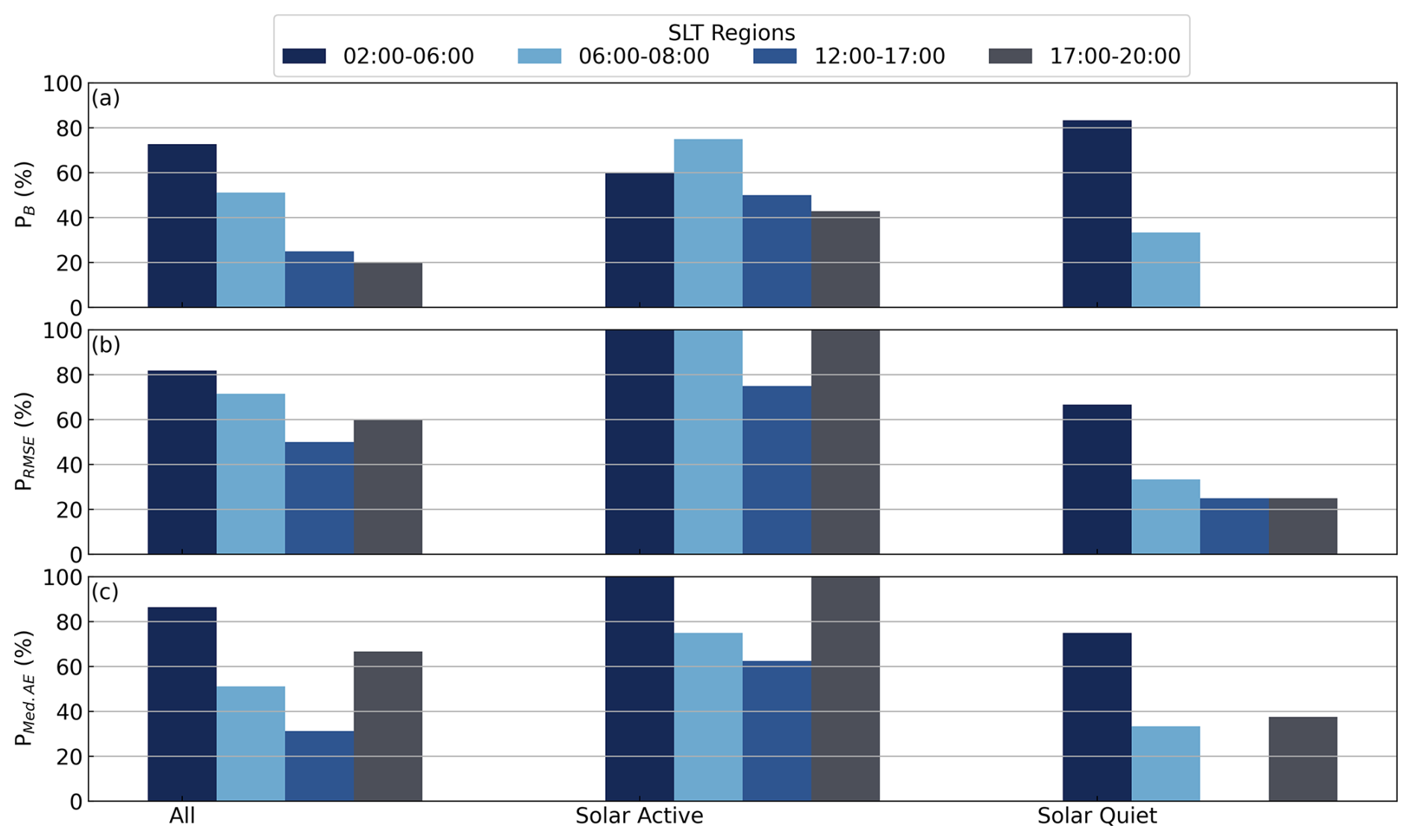 Figure 22Percentage of runs for different SLT regions (differentiated by color) where NIMO outperforms IRI-2016 for DMSP F15-F18 considering PB (a), PRMSE (b), and PMed.AE (c).