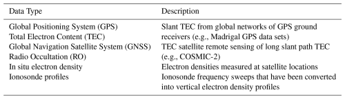 This section provides an overview of the ground- and space-based observational data sets used to validate the electron density provided by NIMO.