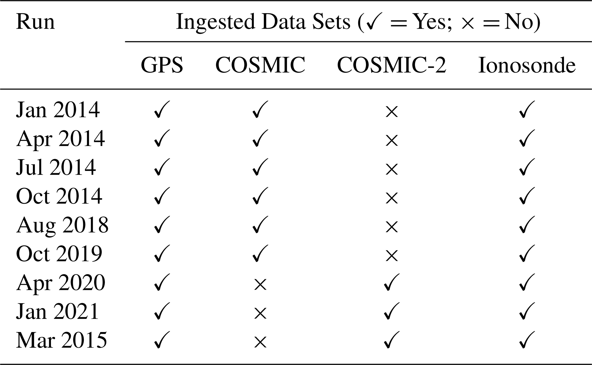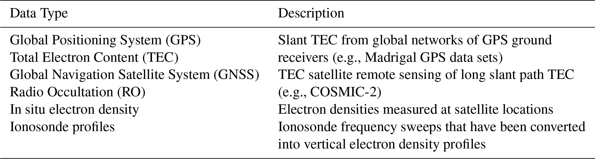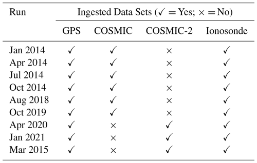 NIMO includes a data pre-processor that reads in the various data sets, performs checks to verify the data is usable, and generates a file with all the data that will be assimilated within a given time step. The code was designed to be easily extensible to new data sources as they become available. This was done by requiring only that the data be manipulated to provide some form of electron density and a grid specifying the data locations in geographic coordinates. The extensibility of the data pre-processor to new data sets has been tested with multiple data sources not included in this study, including Total Electron Content (TEC) derived from lightning measurements (Lay et al.2022) and nighttime ultraviolet (UV) measurements of oxygen airglow from the Special Sensor Ultraviolet Limb Imager (SSULI) and Special Sensor Ultraviolet Spectrographic Imager (SSUSI) instruments aboard the Defense Meteorological Satellite Program (DMSP) satellites. Supported real-time data sets for NIMO v1.0 are listed in Table 1. As noted previously, more recent versions of NIMO (v1.2 and greater) have successfully added the capability to ingest UV radiance observations from SSULI and SSUSI.