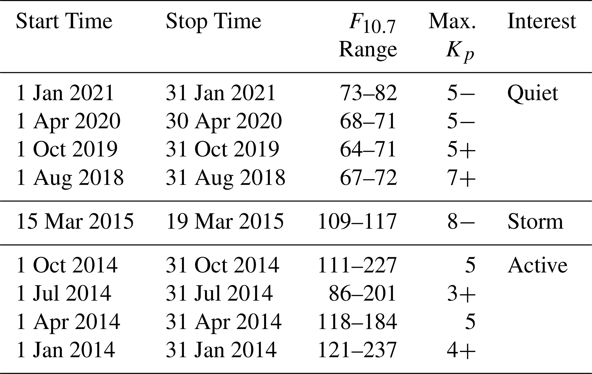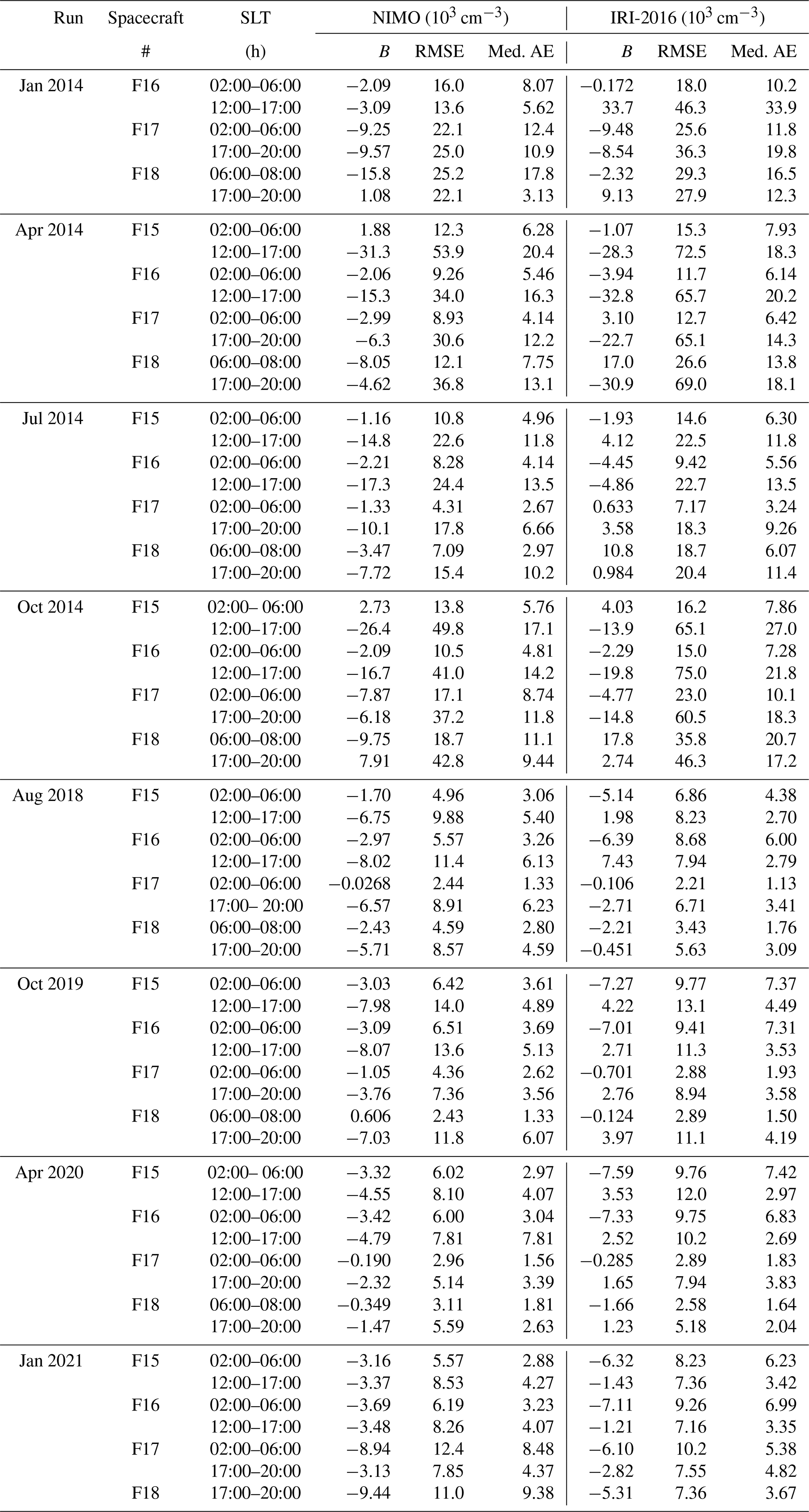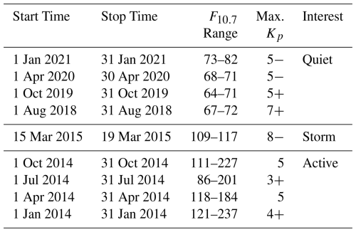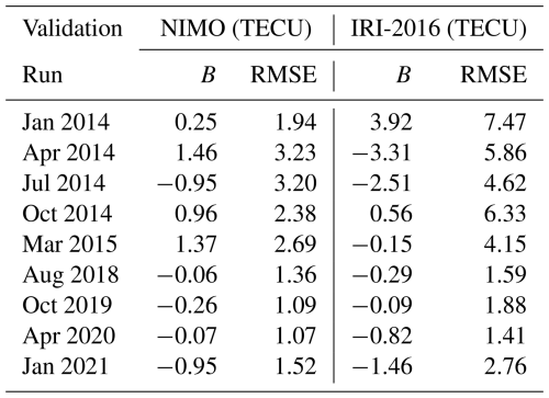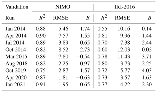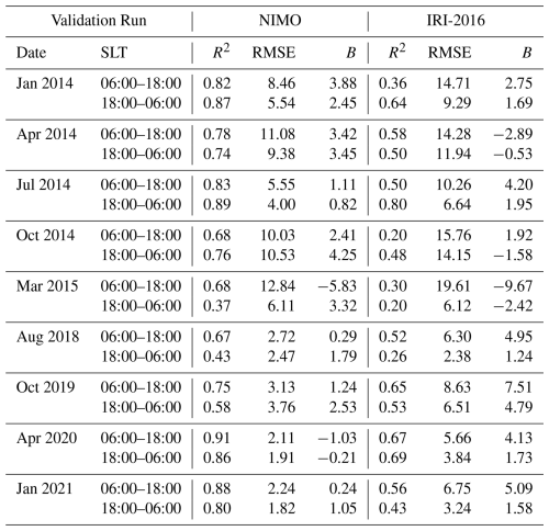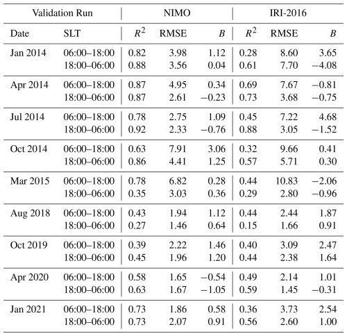 The purpose of this validation is to evaluate the accuracy of the electron density against observations in different spatio-temporal regions, ionospheric layers, and under different solar and geomagnetic conditions for the global NIMO runs. A variety of different validation periods, shown in Table 3, were chosen to ensure representative seasonal and solar cycle coverage under quiet geomagnetic conditions. An additional run that includes a significant geomagnetic storm is also considered to allow evaluation during disturbed geomagnetic times, bringing the total of runs up to nine.