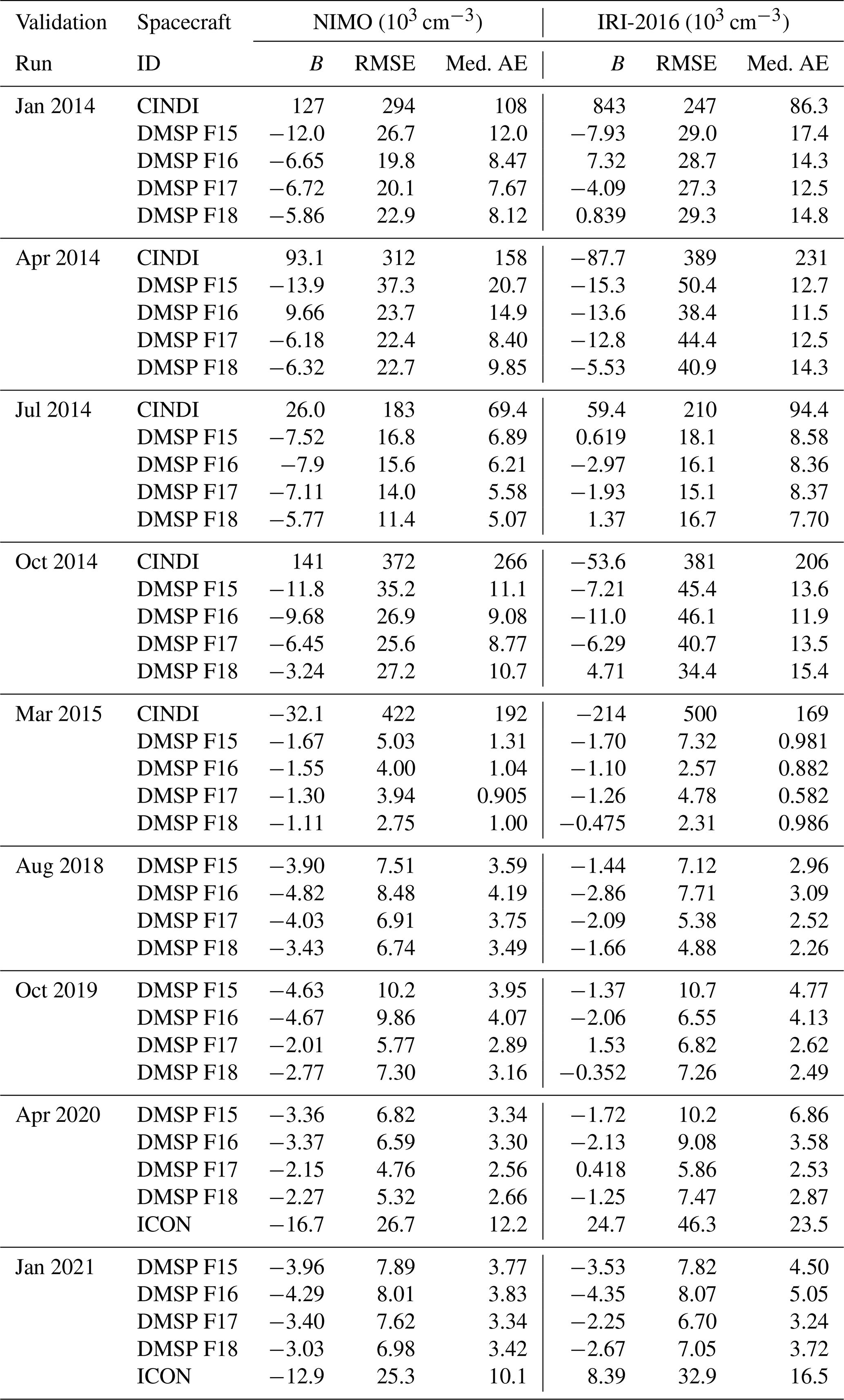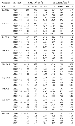 A variety of metrics were employed in this validation. Each metric provides slightly different insight into the model performance and has different weaknesses, and so it was determined that a single metric is not desirable for a comprehensive validation effort. The different observation data sets do not all report an identical set of metrics, due largely to the ease of performance interpretation. For example, the topside plasma density validation using CINDI, ICON, and DMSP uses the median absolute error to reduce the impact of outliers, while the ionosondes used the mean absolute error because the larger quantity of data made outliers less impactful. Despite these differences, all data sets do report the bias (Sect. 4.2.2), allowing a consistent evaluation of the model performance across all observations for this metric.