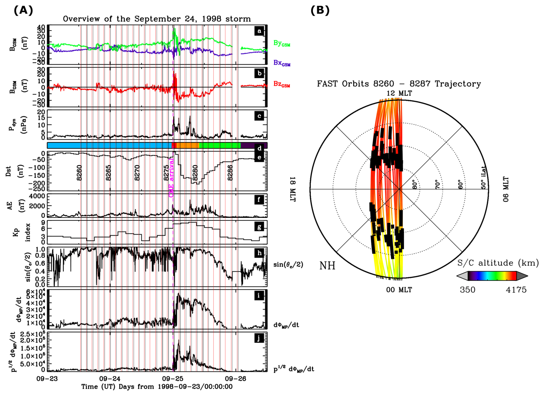 Figure 1Left-hand plot (A): overview of the storm. From top-down, the plot shows (a) the interplanetary magnetic field Bx and By, (b) Bz, (c) the solar wind dynamic pressure, (d) the color code of the storm phase (blue for pre-storm times, dark red for the initial phase, orange for the main phase, and green for the recovery phase), (e) the Dst index, with some orbit numbers labelled at the vertical lines which indicate the start times of the dayside outflows (in red) and the nightside outflows (in black), (f) the AE index, and (g) the Kp index, (h) sin(θc/2), where θc is the IMF clock angle, (i) the rate magnetic flux is opened at the magnetopause, dΦMP/dt, and (j) p1/2dΦMP/dt, where p is the solar wind dynamic pressure (Newell et al., 2007). The magenta vertical line indicates the time of the coronal mass ejection (CME) arrival. Right-hand plot (B): trajectories of the 28 FAST orbits. The coordinate system is magnetic local time by magnetic invariant latitude. The Sun is in the upward direction. The bolded segments represent the time intervals when outflows are observed in either the nightside auroral oval zone or the dayside cusp region, as Strangeway et al. (2005) did but they used 33 orbits and considered data acquired only on the dayside. The color code indicates the spacecraft altitude above the Earth's surface.