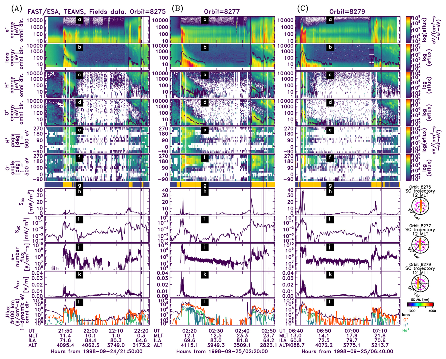 Figure 2 shows the data quantities of this study for three orbits: orbit 8275 (left panel (A)), before the SSC of the storm, orbit 8277 (middle panel (B)), two hours after the SSC, and orbit 8279 (right panel (C)), towards the end of the main phase, indicating the progression during the storm. FAST was moving through the dayside cusp region over the polar cap and over the nightside auroral oval zone during each orbit, as shown at the far right in the plot. For each orbit, the panels, from top to bottom show (a) electron spectrograms from the eESA instrument, (b) omnidirectional ion spectrum from the iESA instrument, (c and d) H+ and O+ omnidirectional energy spectra from the TEAMS instrument, (e and f) pitch angle distributions of H+ and O+ integrating from 1–500 eV, (h–k), the DC Poynting flux, the Alfvénic Poynting flux, the electron number flux, and the amplitude of the ELF waves. Panel (l) shows the ion outflow flux for the three species H+, O+, He+, as well as the all-ion outflow flux from the iESA instrument. We note that there are significant differences between the iESA instrument and the TEAMS instrument. Their minimum energy is slightly different, the iESA measures a 2D distribution while TEAMS measures the full 3D distribution, the iESA is more susceptible to penetrating electron background, and TEAMS requires a large dead time correction during high fluxes, which leads to a larger uncertainty. Thus, we do not expect the two measurements to be identical, but we certainly expect them to show the same trends.