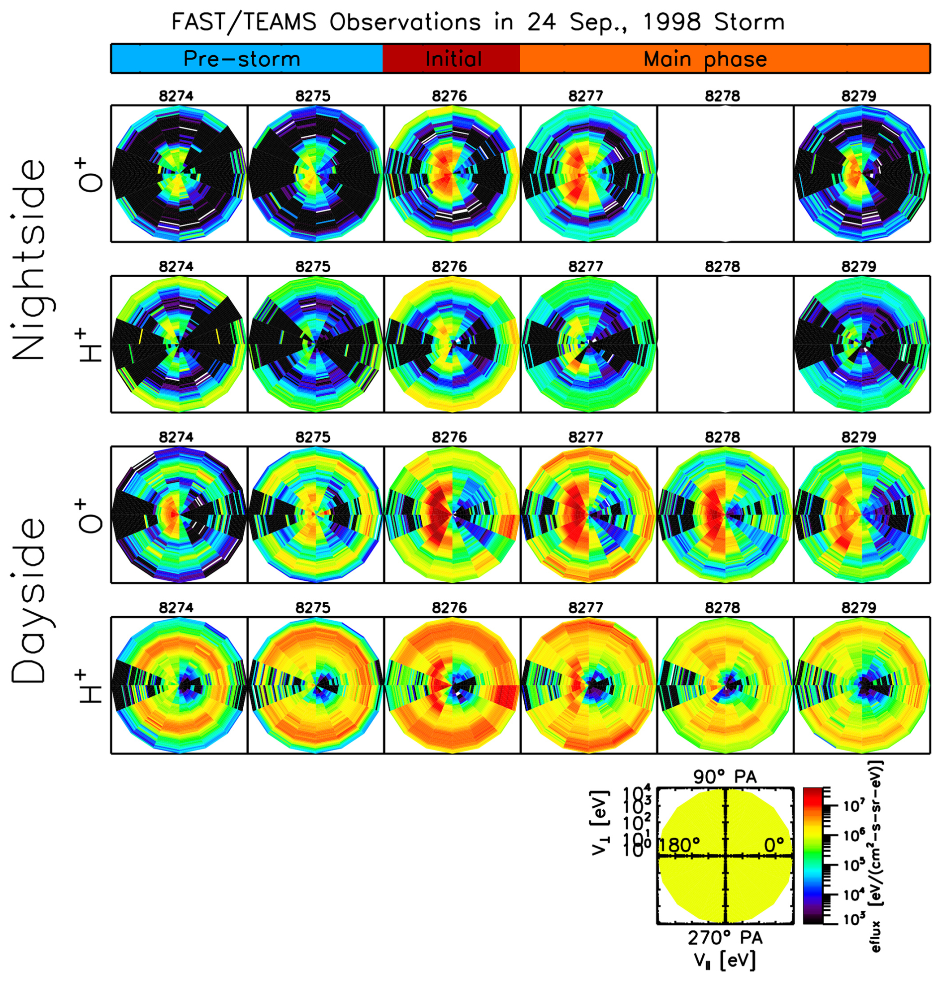 The progression of the O+ and H+ outflows during the storm can also be seen in the energy–pitch angle distributions. The TEAMS data is sorted into an array with 48 energy channels and 16 pitch angle directions. The data are averaged over the outflowing time interval by the method described above to get the energy–pitch angle distributions. The pitch angle goes from 0–360°, considering the 360° field of view (FOV) of the TEAMS instrument. The energy of the ions moving in the direction of the pitch angle 0 represents the parallel velocity, V|| (units, eV), while the energy of the ions moving in the direction of either pitch angle 90 or 270° represents the perpendicular energy, V (units, eV). Based on the distribution, we can compare the characteristics and the intensity of the outflows from different ion species and different locations.