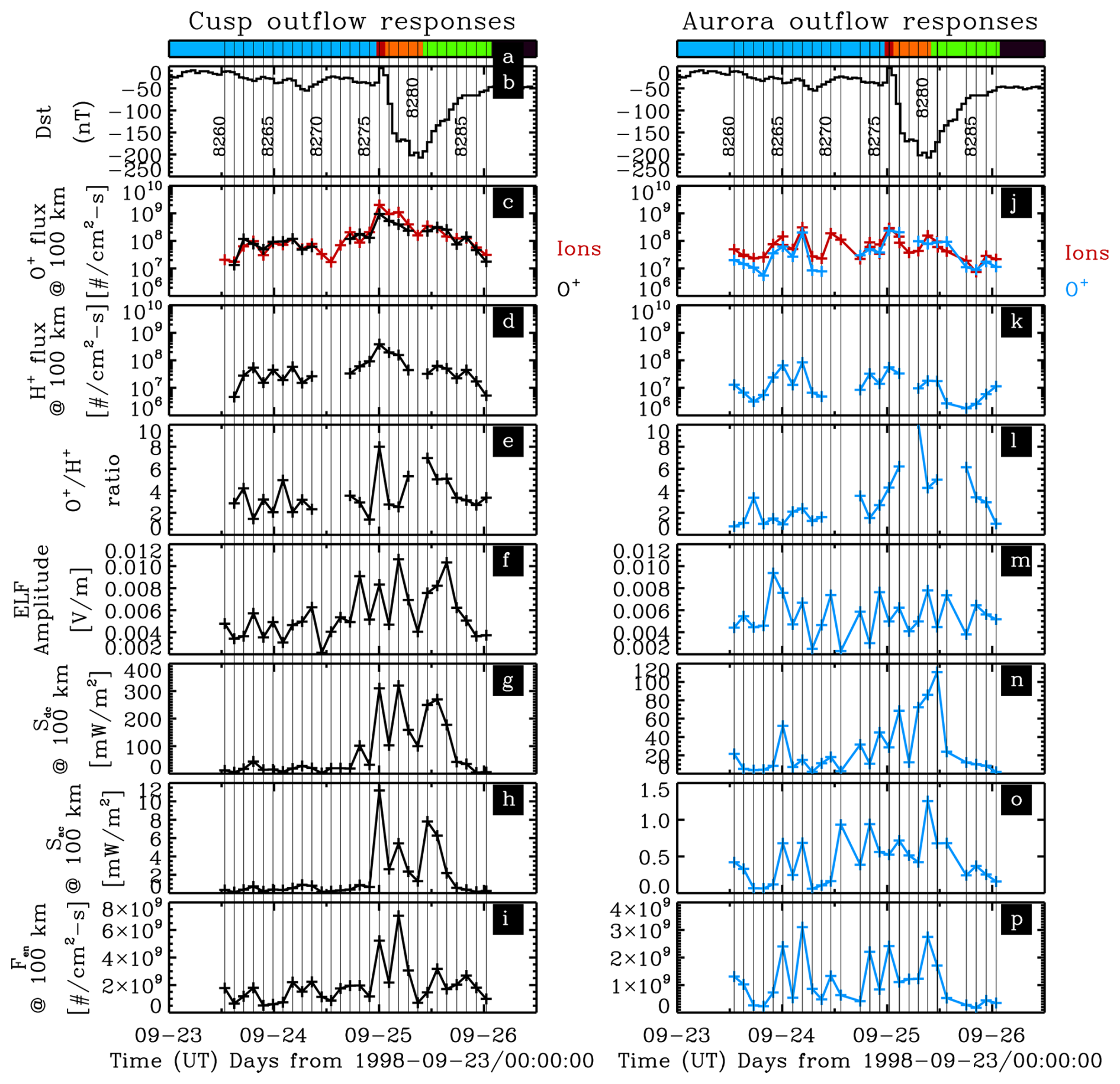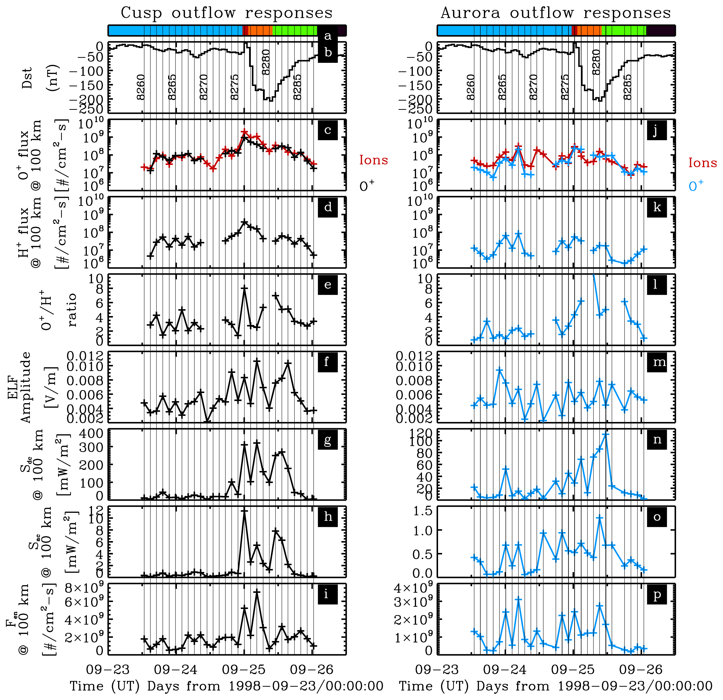 An interplanetary shock from a large CME arrived at the Earth's magnetopause with a space speed of 769 km s−1 at 23:45:00 UT on 24 September 1998 (Russell et al., 2000). It was observed at 25 September 1998/00:00:00 UT by the FAST satellite when it entered the dayside cusp region, 16 min later. During the storm, the Earth's magnetopause was moved inward and the dayside magnetospheric boundaries are pushed tailward. Significant energy was injected into the ionosphere in both the dayside cusp region and the nightside auroral oval zone, producing remarkable outflows. The storm, which occurred during the rising phase of solar cycle 23, had a solar radio flux at 10.7 cm wavelength (F10.7) between 136.2 and 144.1 s.f.u. (10-22W(m2Hz)-1) from 23–26 September 1998.