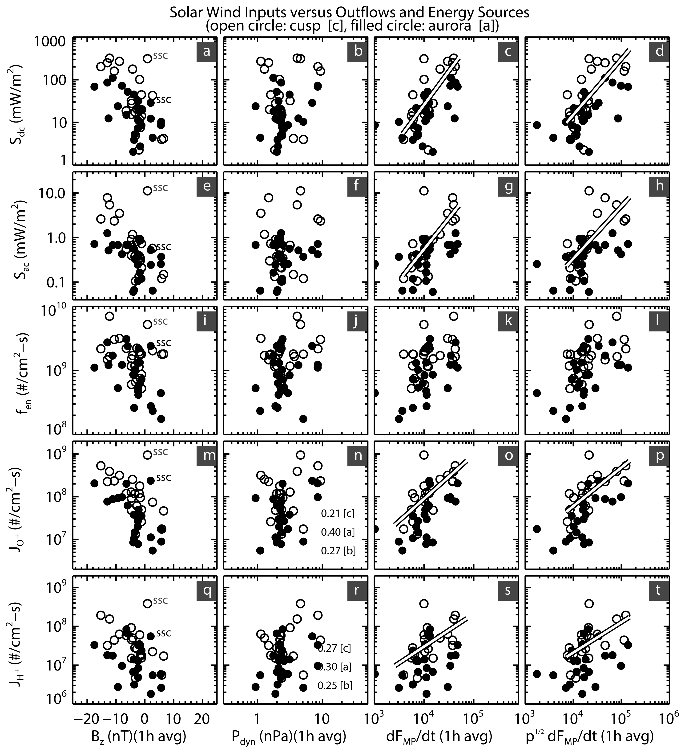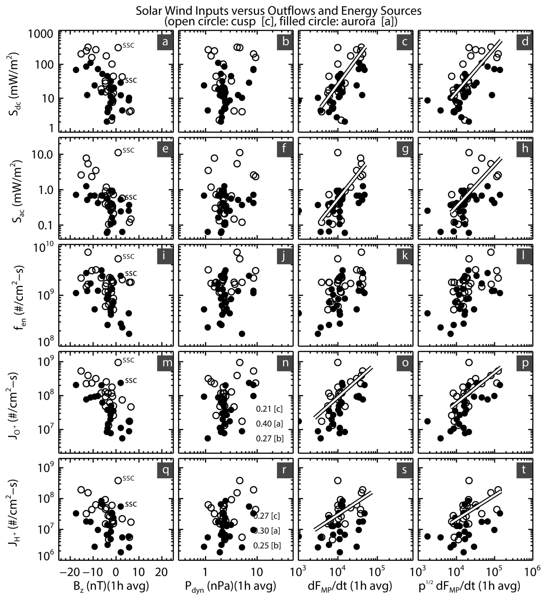Figure 5Scatter plots of the solar wind-magnetosphere coupling functions, Bz (leftmost column), Pdyn (second column from the left), dΦMP/dt (third column from the left) and p1/2dΦMP/dt (rightmost column) versus the energy inputs, including Sdc, Sac, and fen , and the outflow fluxes, including JO+ and JH+. Intensities of the particle fluxes are averaged over the time period of the dayside cusp outflow (open circle) and the nightside aurora outflow (filled circle), while the maxima of Sdc and Sac are used. The coupling functions are the averages over one hour prior the outflows observed by FAST. Correlations are computed for the dayside cusp, the nightside aurora, and the both regions, individually. In panels (c), (d), (g), (h), (o), (p), (s)(t), the best fitting lines are added to the scatters of the solar wind coupling functions, dΦMP/dt and p1/2dΦMP/dt versus the energy inputs and the outflows in the cusp region.