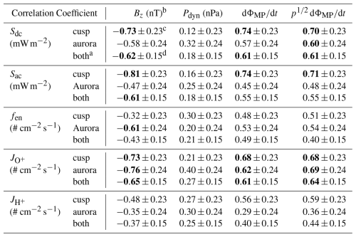 a The data from both the cusp and the aurora are combined in this case. b The scatter in the initial phase is excluded in the correlation to Bz. c The uncertainty covers one standard deviation from the mean (approximately α≈0.30). d The absolute correlation coefficients above 0.60 are marked in bold.